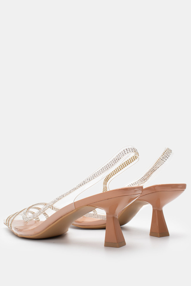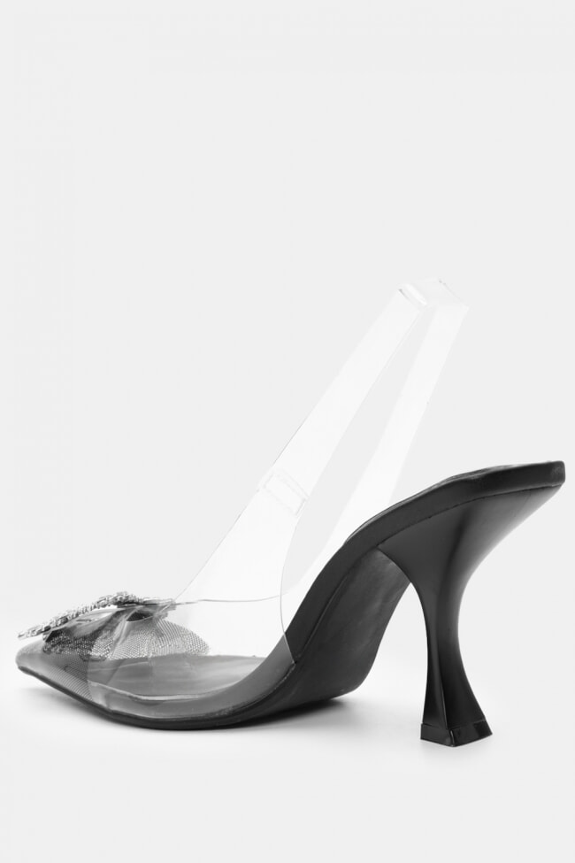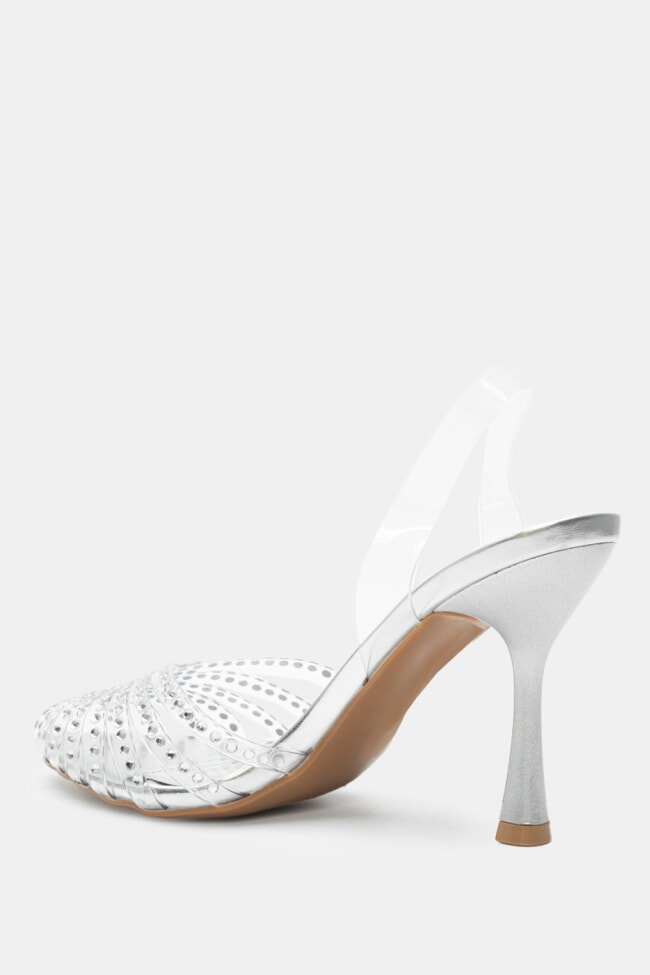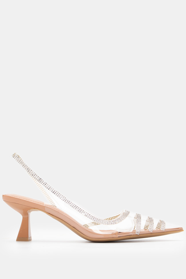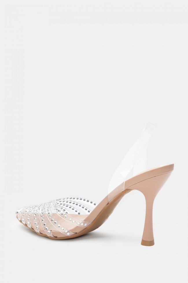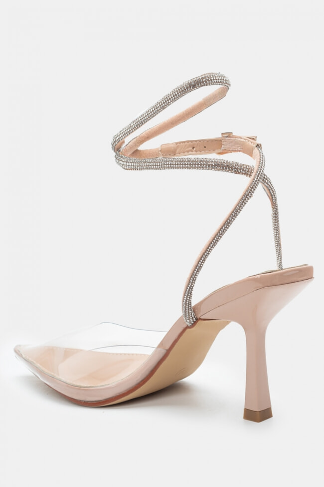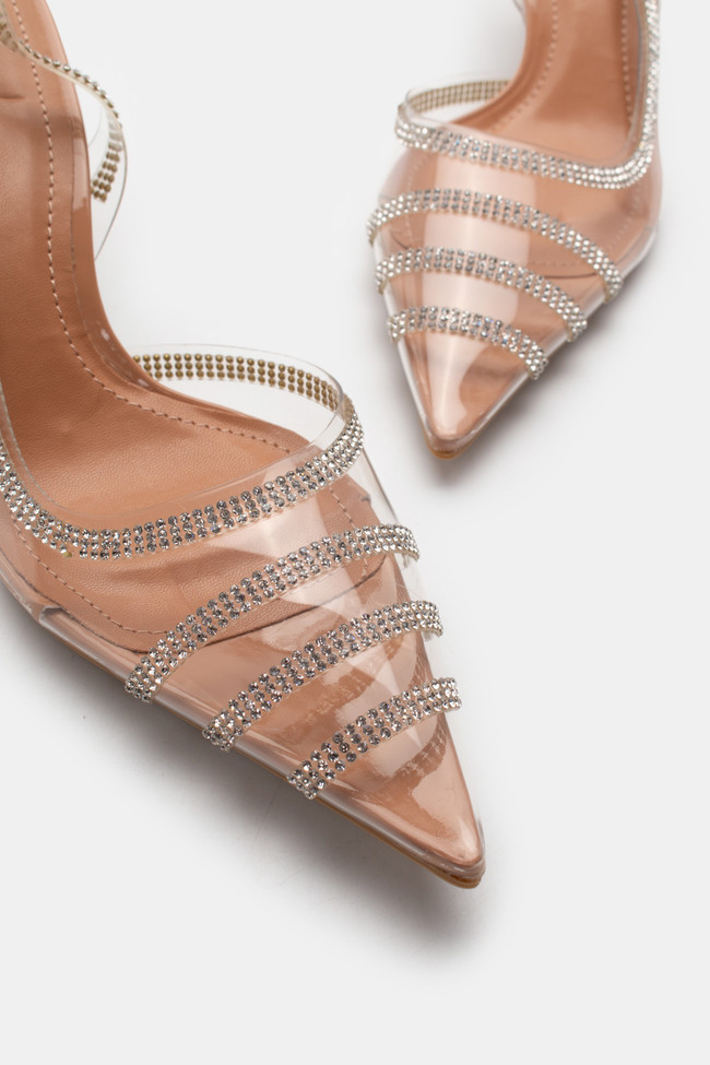 Обувки на ток с прозрачни елементи, украсени със стразове и ластик