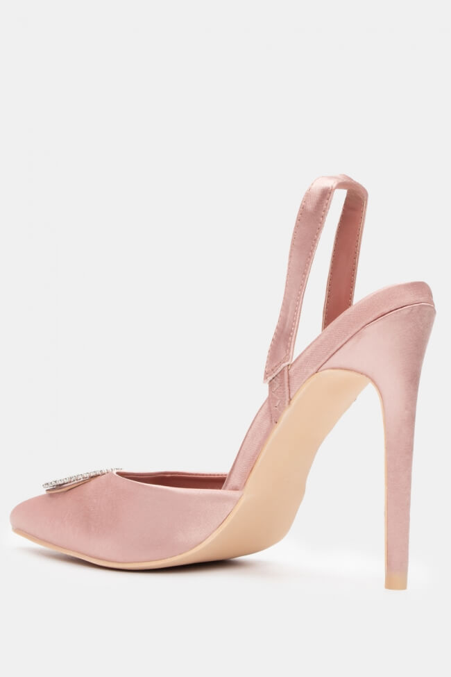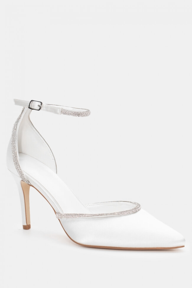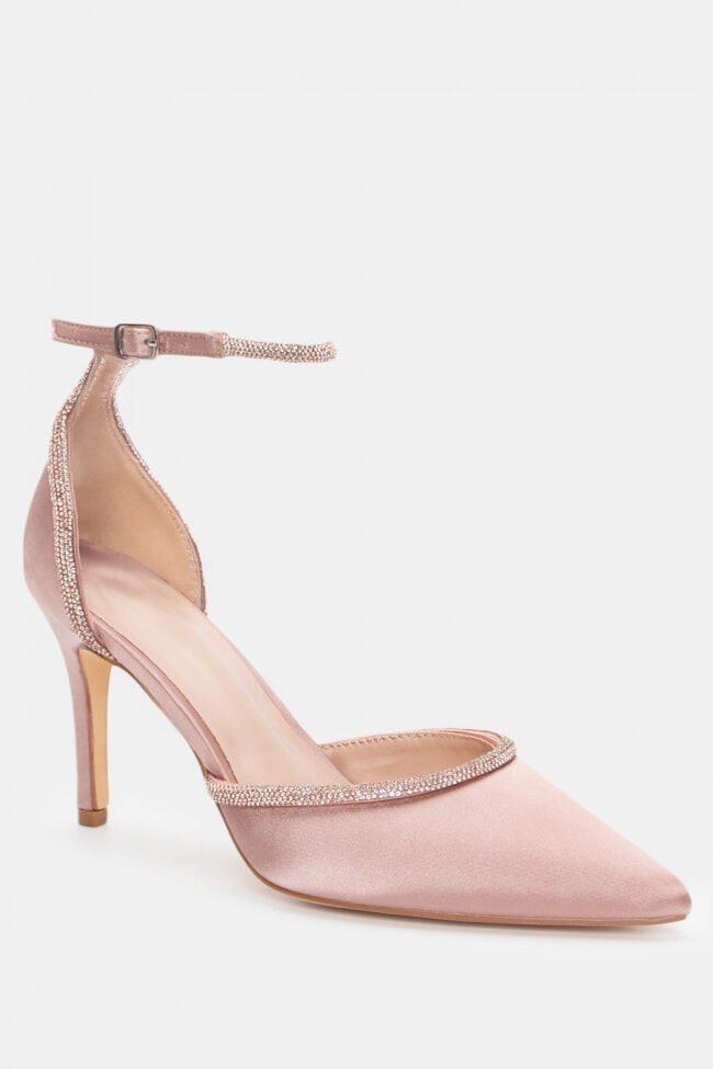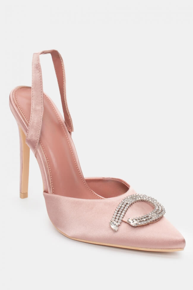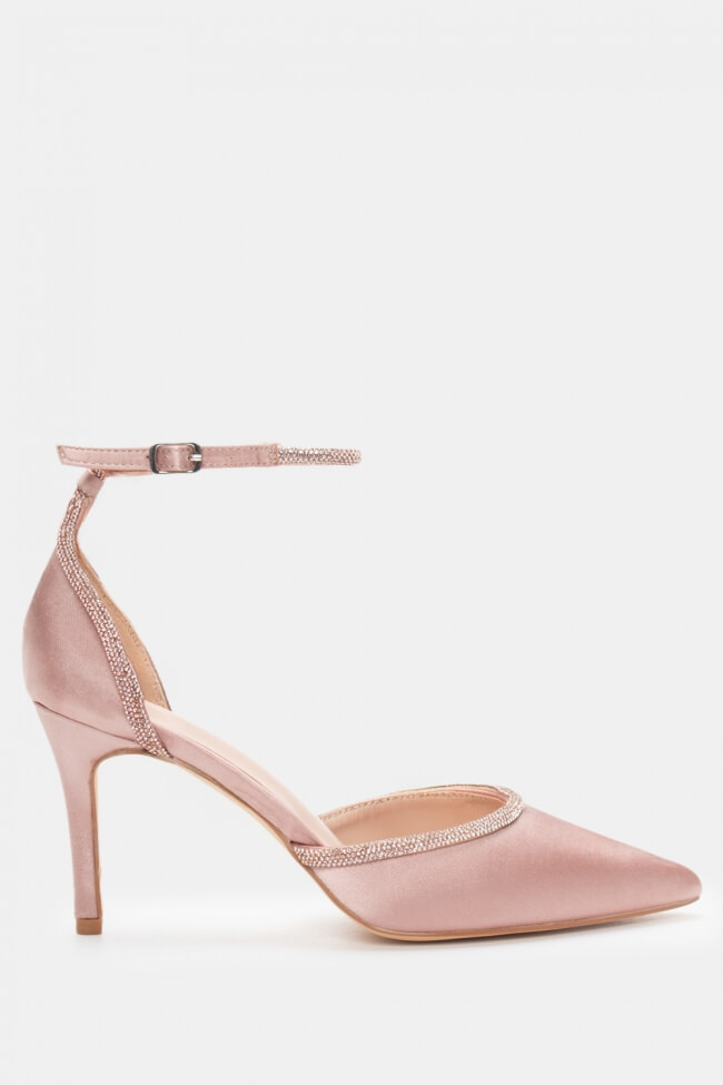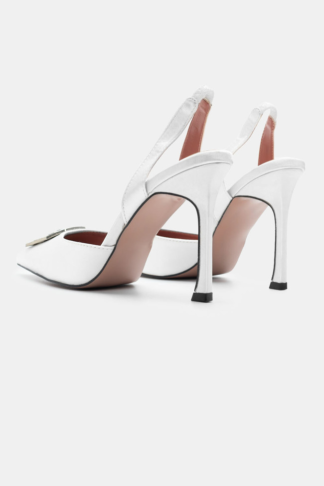 Остри сатенени обувки с декоративна катарама и ластик