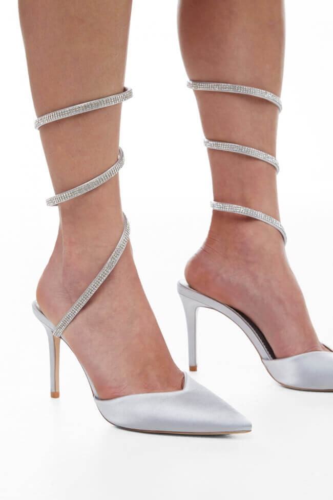 Обувки с въртяща се каишка и декоративна панделка от страс.