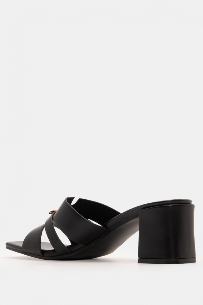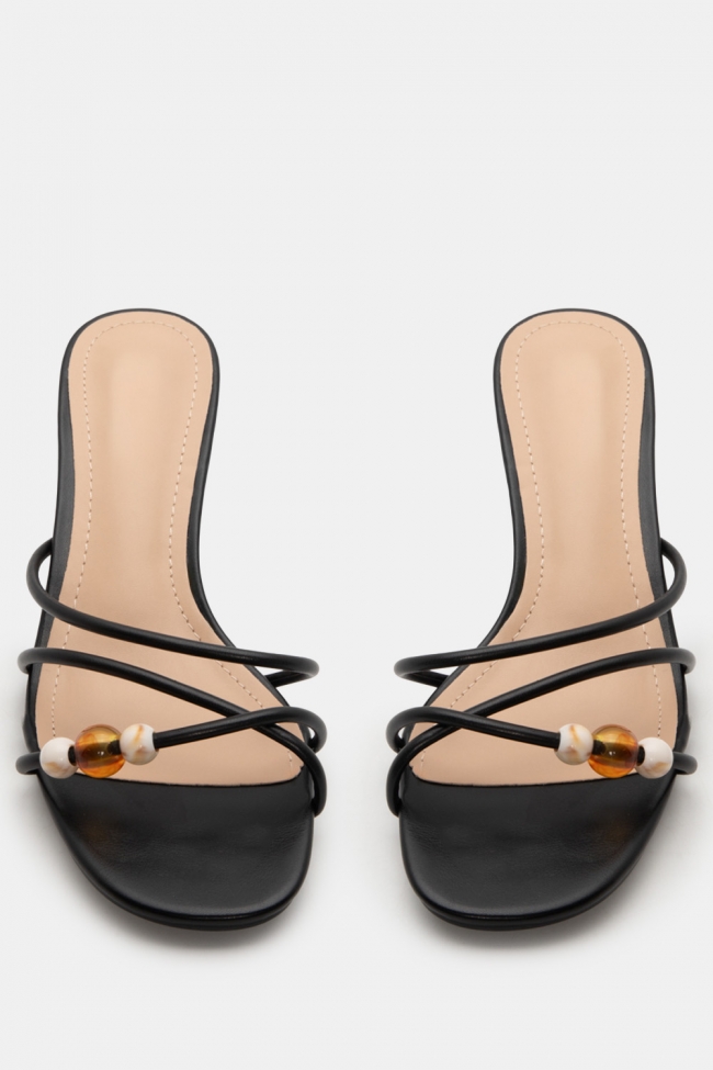 - Отворени мулета със скручена лента: Имат нещо елегантно и игриво едновременно. Скрученият лента привлича окото и добавя движение. Особено ако го съчетаете с изцяло черен външен вид, прави цялата разлика.