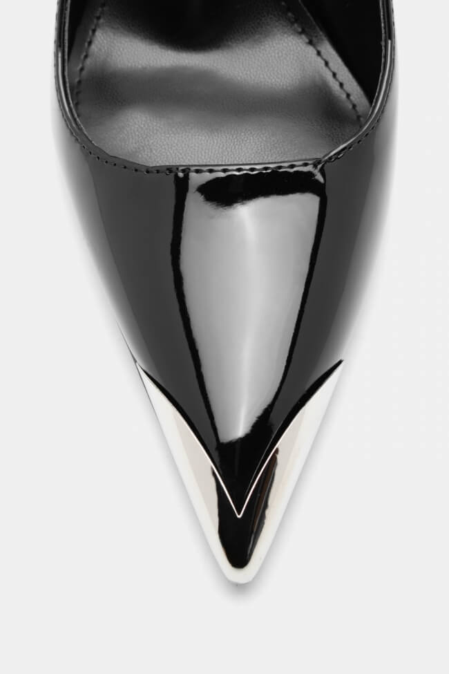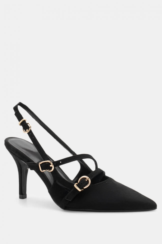 Décolleté a punta con cinturino obliquo e barra.