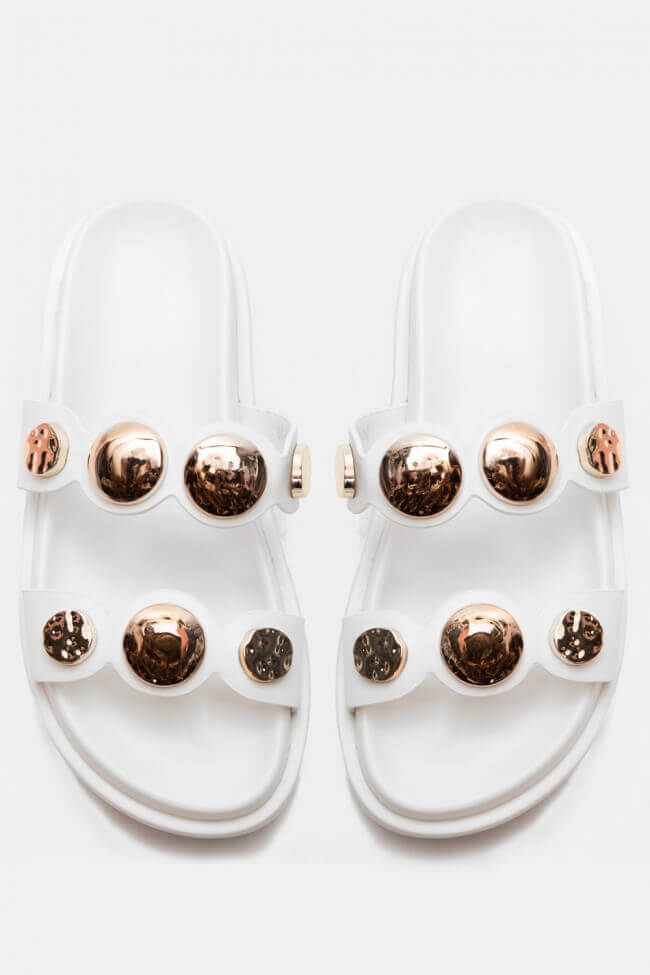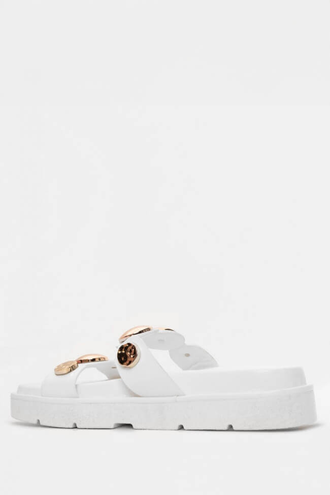 Flatforms με τρουκς σε μεταλλικές αποχρώσεις (χρυσό, bronze, silver) είναι το απόλυτο fashion moment. Φοριούνται άνετα σε βραδινά looks ή ακόμα και με casual total white outfit για ένα wow αποτέλεσμα.