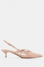 Pantofi cu vârf ascuțit, curele cu închidere, cataramă metalică și toc.